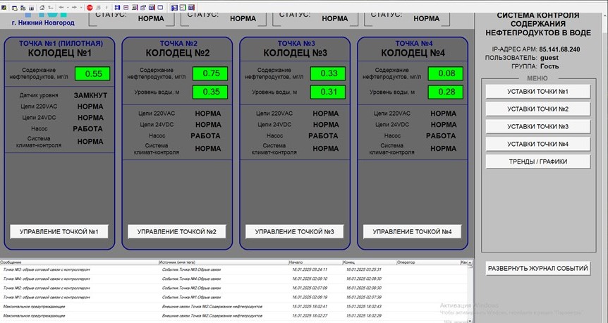 Управление работой системы мониторинга и анализ полученных данных от нефтеанализаторов осуществляется с рабочей станции, расположенной в нашем инженерном центре . В случае превышения количества нефтепродуктов в сточных водах выше установленных норм, помимо оповещения в системе управления, предусмотрена рассылка SMS-сообщений всем ответственным лицам для принятия незамедлительных мер реагирования и устранения нарушения.